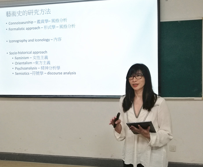 在讲座中,李蕴诗教授先是介绍了艺术史研究中的鉴赏学(connoisseurship)、形式学(formalistic)的风格分析方法和图像内容分析方法(iconography and iconology),以及包括女性主义(feminism)、东方主义(orientalism)、精神分析学(psychoanalysis)、符号学(semiotics)等在内的社会历史方法(socio-historical approach)。随后,李蕴诗教授带领大家鉴赏和分析了明代画家仇英的名作《园居图》,向大家介绍了这幅名作的手卷大小,以及与挂卷的区别;并解释道,在研究艺术作品时,首先要通过直观观赏的方法,去获取艺术作品中的表面信息。仇英这幅作品问世时,称作《园居图》,意即当时拙政园一名还未正式出现。