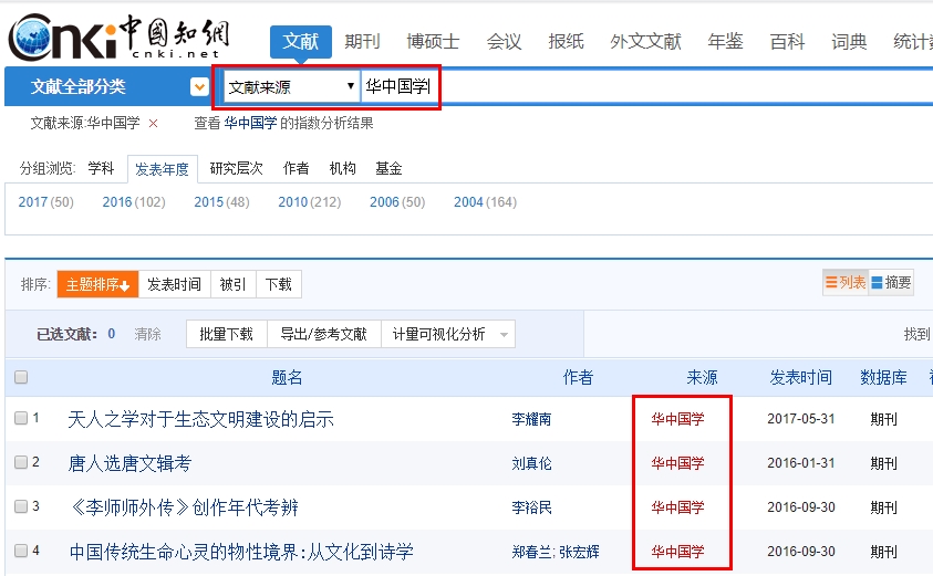 中国知网是中国学术资源最丰富、应用最广泛在线学术数据库。《华中国学》被中国知网收录以后,将成为该网数据库收录的四大国学期刊之一,与中国人民大学的《国学学刊》、四川大学的《新国学》和四川省社会科学院的《国学》共同成为繁荣中国传统学术研究的重要阵地。